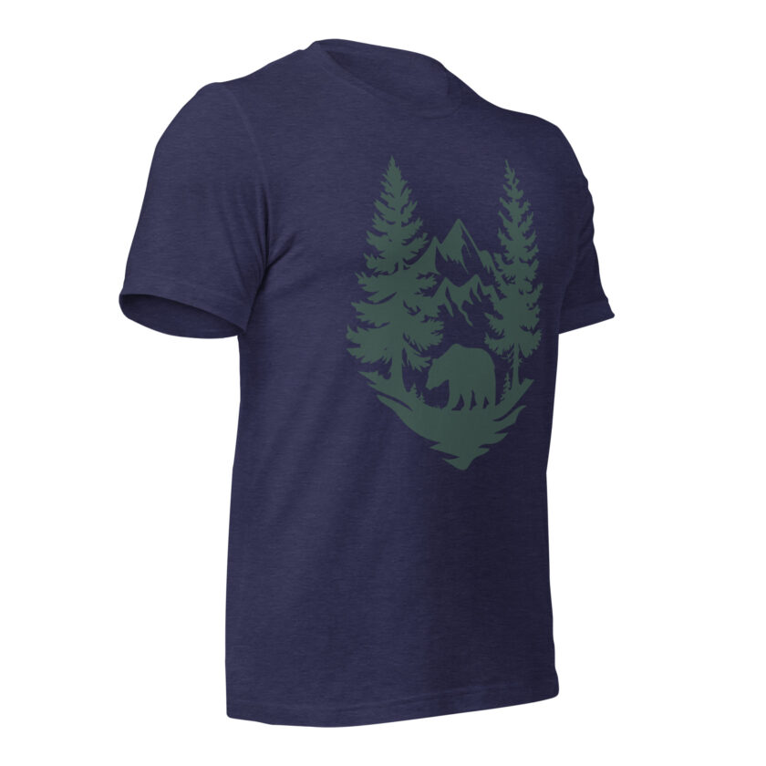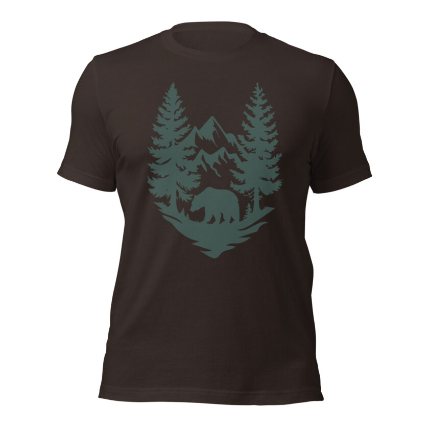 Capture the spirit of the great outdoors with this Wilderness Bear Trek design! This striking artwork features a bold silhouette of a bear set against a rugged mountain backdrop, framed by towering pine trees and a moody sky. The minimalist yet detailed style perfectly evokes the calm and power of nature, ideal for adventurers, hikers, and wildlife enthusiasts alike.